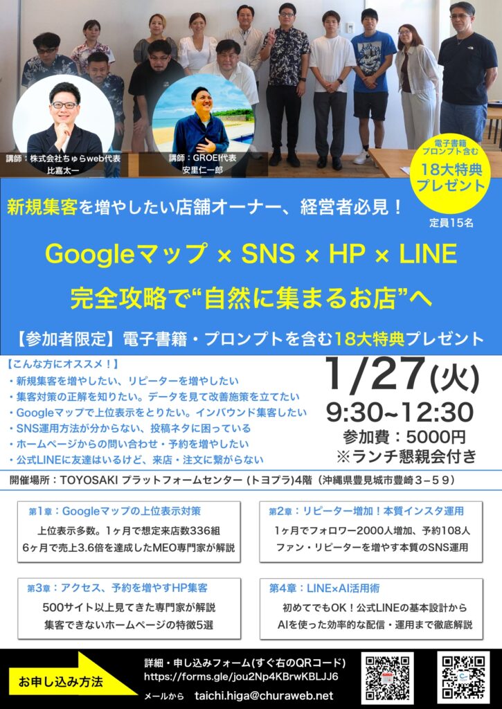 それが、たった1人で広告費0円で業種問わず40店舗以上の認知拡大、来店数を改善してきたWEB集客コンサルタントが行うWEB集客セミナーです。